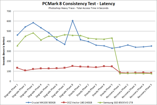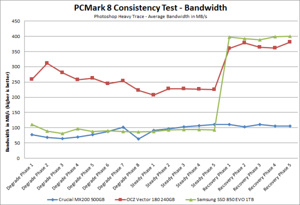PCMark 8 also includes a consistency test which measures the performance consistency and degradation tendency of a storage system. The test reports the performance level at the start, the degraded steady-state and the recovered state as well as the number of iterations required to reach the degraded state and the recovered state. For this test, we are focusing on the Adobe Photoshop (Heavy) trace and will look at both the bandwidth and latency of the drive