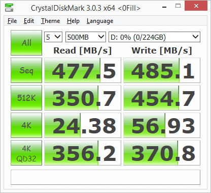 First, I ran a few quick tests using CrystalDiskMark. This benchmark tool measures the performance of a storage device by testing its sequential read and write speeds as well as its random read and write speeds using blocks 512K and 4K in size.