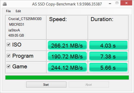 AS SSD also includes a copy benchmark. This test copies an ISO (two large files), program (many small files) and game (small and large files), returning the speed and duration of each.