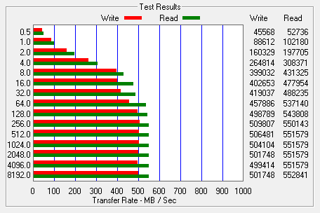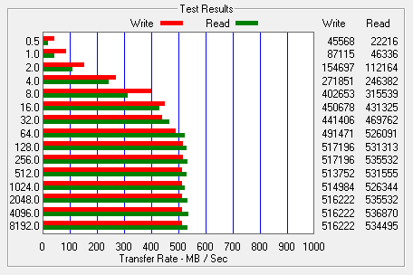 When tested with ATTO, the MX300 M.2's read speeds topped out at about 536 MB/s and its write speeds at 516 MB/s.