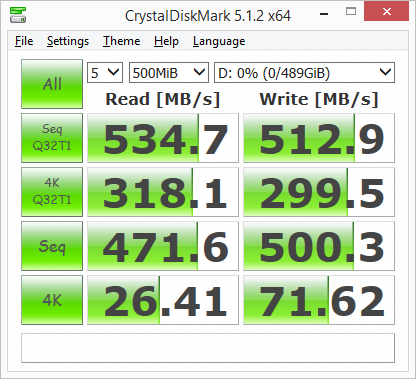 According to Crucial, the 525GB version of the MX300 M.2 is capable of reading at 530 MB/s and writing at 510 MB/s. Looking at the screenshot above, you can see that the drive had no problems reaching these speeds in CrystalDiskMark's sequential read and write tests.