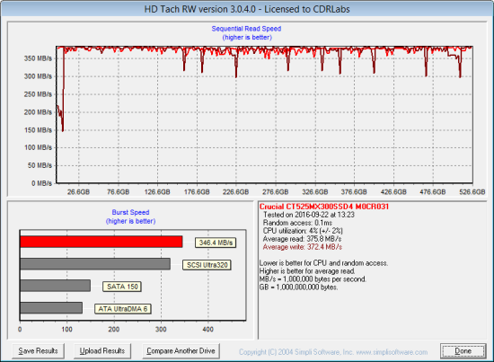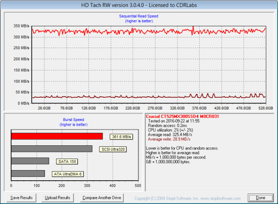 Next, I used HD Tach to test the MX300 M.2's read, write and burst speeds as well as its seek times and CPU usage.