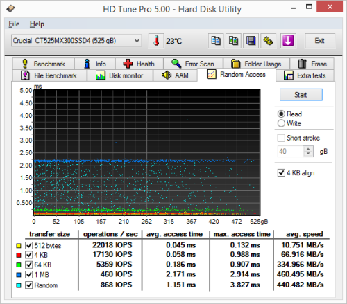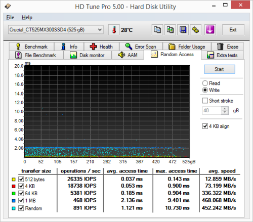 Next, I ran a series of tests using HD Tune Pro. This hard disk utility measures a drive's performance by testing its sequential read and write speeds as well as its access time, burst rate and CPU usage. For this review, I'm also going to use it to benchmark the MX300 M.2's random read and write speeds, random access times and the number of operations per second.