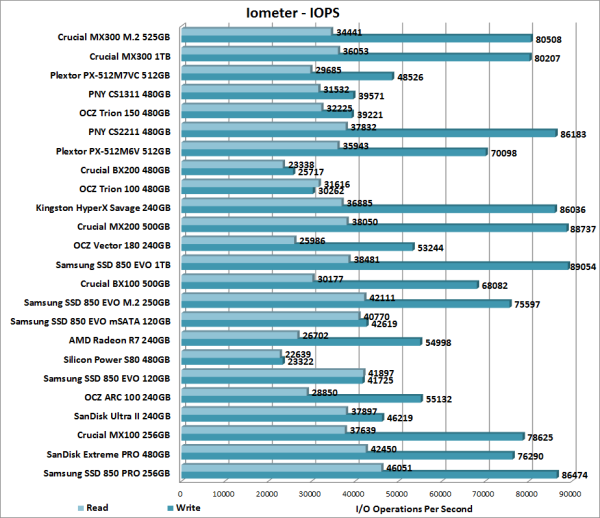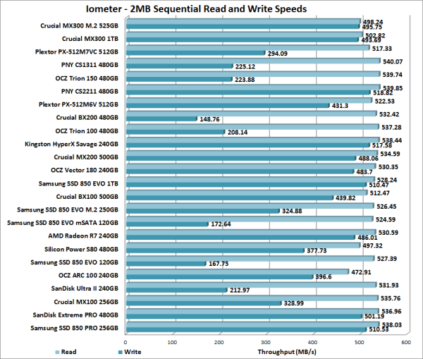 To test the performance of Crucial's MX300 M.2 SSD, I ran a series of benchmarks using CrystalDiskMark, HD Tach RW, ATTO Disk Benchmark, AS SSD, HD Tune Pro, Anvil's Storage Utilities, Iometer and PCMark 8. For comparison, I've also included test results from the Crucial M300, Plextor M7V, PNY CS1311, OCZ Trion 150, PNY CS2211, Plextor M6V, Crucial BX200, OCZ Trion 100, Kingston HyperX Savage, Crucial MX200, OCZ Vector 180, Kingston BX100, Samsung 850 EVO M.2, Samsung 850 EVO mSATA, AMD Radeon R7, Silicon Power Slim S80, Samsung SSD 850 EVO, OCZ ARC 100, SanDisk Ultra II, Crucial MX100, SanDisk Extreme Pro and Samsung SSD 850 PRO.
