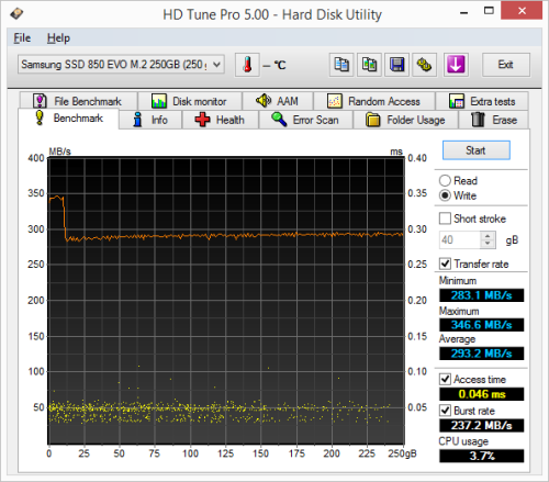 To see how well the MX300 M.2 could recover, I let the computer sit for about 30 minutes and then reran the test. The drive wasn't able to reach the factory fresh performance shown in our earlier tests. However, its average write speed climbed up to 283.5 MB/s.