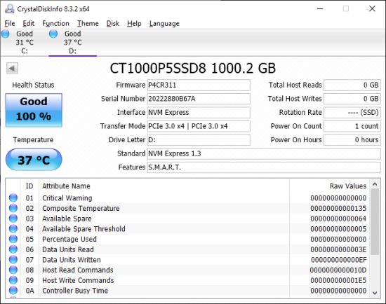 Model: Crucial P5 1TB PCIe M.2 Solid State Drive