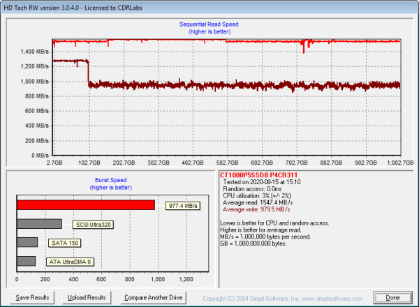 Looking at the screenshot above, you can see that the P5 had average read and write speeds of 1,547.4 MB/s and 979.5 MB/s respectively, as well as a burst speed of 977.4 MB/s. The screenshot also shows that, like most other TLC-based SSDs, the P5 uses some sort of SLC caching. The drive starts writing at about 1,275 MB/s and then drops to about 950 MB/s when the write operation exceeds the size of the cache.