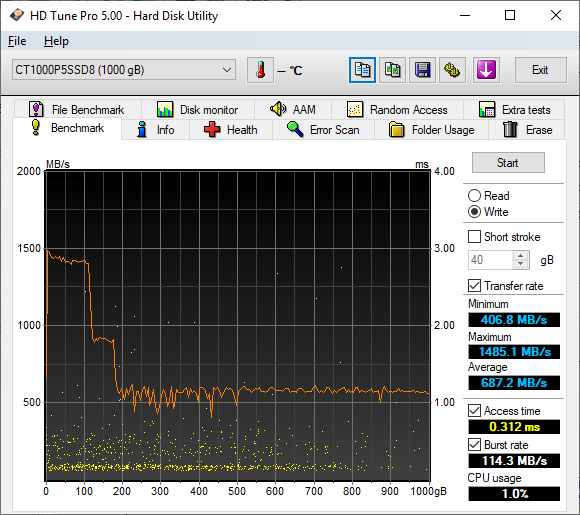 The P5 didn't perform as well as expected when benchmarked with HD Tune. The drive had average read and write speeds of 1599.0 MB/s and 1453.1 MB/s, respectively.