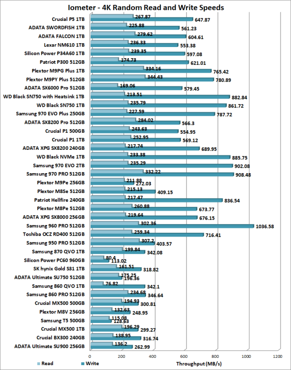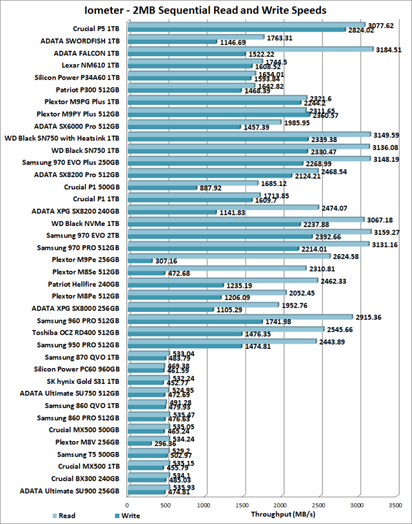To test the performance of Crucial's P5 SSD, I ran a series of benchmarks using CrystalDiskMark, HD Tach RW, ATTO Disk Benchmark, AS SSD, HD Tune Pro, Anvil's Storage Utilities, Iometer and PCMark 8. For comparison, I've also included test results from the ADATA SWORDFISH, ADATA FALCON, Lexar NM610, Silicon Power P34A60, Patriot P300, Plextor M9PG Plus, Plextor M9PY Plus, ADATA XPG SX6000 Pro, Western Digital WD Black SN750, Samsung 970 EVO Plus, ADATA XPG SX8200 Pro, Crucial P1, ADATA XPG SX8200, Western Digital WD Black NVMe, Samsung 970 EVO, Samsung 970 PRO, Plextor M9Pe, Plextor M8Se, Patriot Hellfire, ADATA XPG SX8000, Samsung 960 PRO, Toshiba OCZ RD400, Samsung 950 PRO, Samsung 870 QVO, Silicon Power P60, SK hynix Gold S31, ADATA Ultimate SU750, Samsung 860 QVO, Samsung 860 PRO, Crucial MX500, Plextor M8V, Samsung T5, Crucial BX300 and ADATA Ultimate SU900.