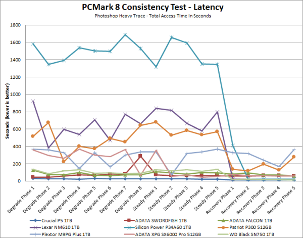 The P5 did quite well throughout PCMark's consistency test. While the average bandwidth dropped below 800 MB/s during the degradation and steady state phases, it was still considerably faster than most of the other PCIe SSDs that we've tested. More importantly, the P5 had no problems bouncing back during the recovery phase.