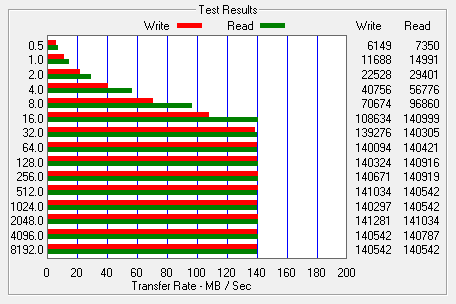 I also used ATTO Disk Benchmark to test the Hitachi Deskstar 5K3000's sequential read and write speeds. The test was run using blocks ranging in size from 0.5KB to 8192KB and the total length set to 256MB.