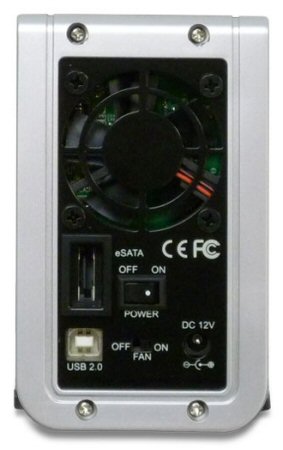 The rear of the X2-RAID is pretty straight forward. The enclosure has a 50mm fan that can be turned on or off using a small switch. Below the fan there is an eSATA port, USB port, DC power connection and the main power switch.