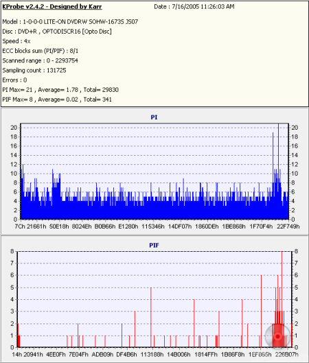 So what about writing quality? Testing a drive's DVD writing quality isn't easy. Until now, there were very few options, unless you wanted to shell out thousands of dollars for a certified test machine. Thanks to KProbe, we can test a disc's PI (Parity Inner) and PIF (Parity Inner Fail) rates.For these tests I used a Lite-On SOHW-1633S (firmware BS0S) and read the discs at 4x with the PI and PIF ECC sums set to 8 and 1 respectively. For comparison, I also tested the discs on a BenQ DW1620. When combined with Nero CD Speed, the DW1620 is able to report PI Errors, PI Failures, Parity Outer Failures and even jitter levels. For this test, the discs are read at 8x with both the PI and PIF ECC sums set to 8.