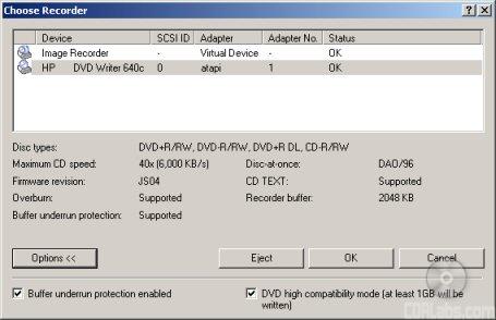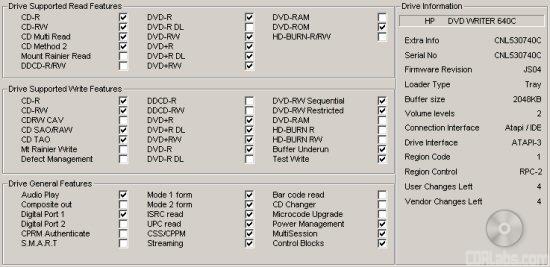 Nero also shows that the dvd640i has a maximum CD writing speed of 40x and a 2048KB buffer. This buffer is also backed up by some form of buffer underrun protection. According to Nero, HP's new DVD writer can also write CD-Text and overburn. When testing the drive's capacity, it had no problems overburning up to 99 minutes with our CompUSA media.