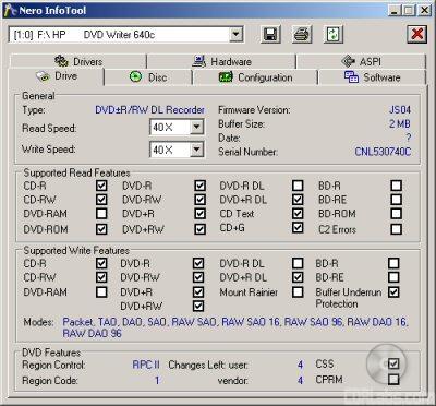 Here is a screen shot from Nero's InfoTool. This program queries the drive to see what its reading and writing capabilities are. InfoTool had no problems detecting the dvd640i's maximum reading and writing speeds, recording modes, buffer underrun protection and 2MB buffer.