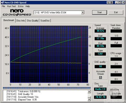 Reading and writing CD's wasn't a problem for the dvd640i either. In our tests, the drive was able to read all types of media at 40x and had some good seek times. This level of performance carried over to our DAE tests, where HP's new drive ripped audio CD's at 40x. As a writer, the dvd640i performed as expected. The drive's 40x CD-R writing speed did put it at a slight disadvantage in some of our tests. However, its writing quality was very good.