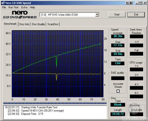CD Write Tests: To test the write speeds, Nero Burning Rom is used to write 650MB and 700MB to our test media. Times are recorded. To test rewrite scores, Nero is used again to time how long it takes to write 400MB of random files and directories. Then Sonic's DLA is used to test packet writing speeds. The same files are copied and pasted in Windows Explorer and timed.