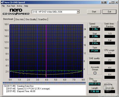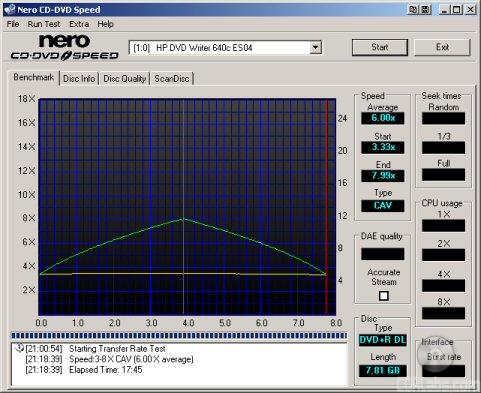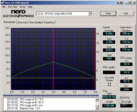 HP's new DVD writer had no problems reading Verbatim's double layer DVD+R media. The dvd640i started reading at 3.35x and reached a maximum transfer speed of 8.07x.