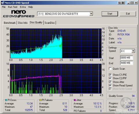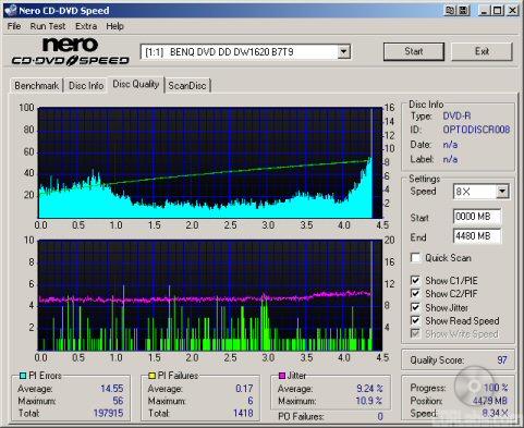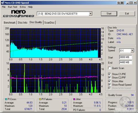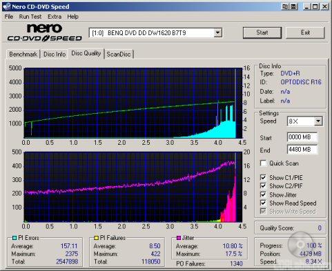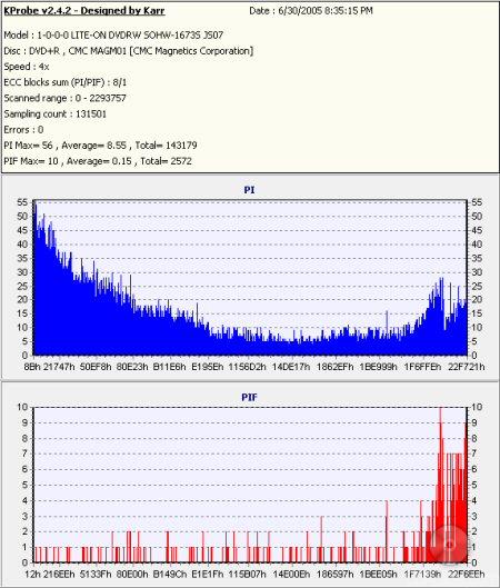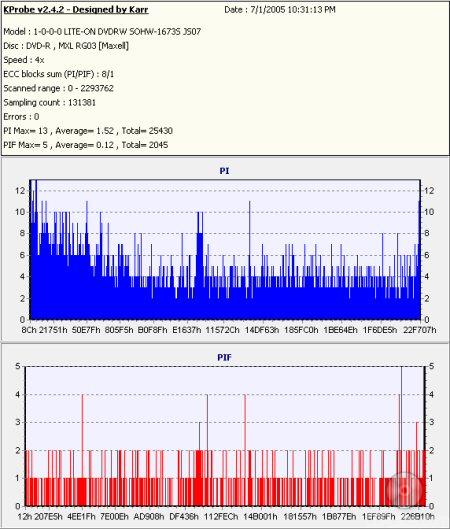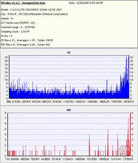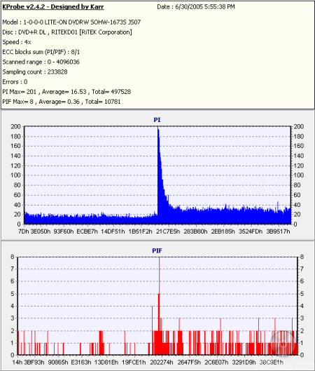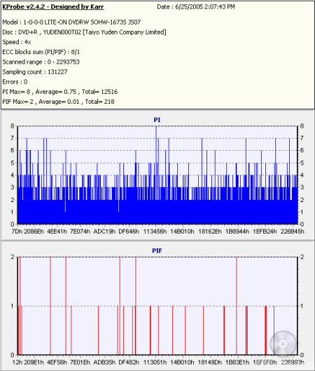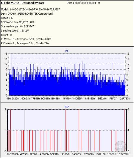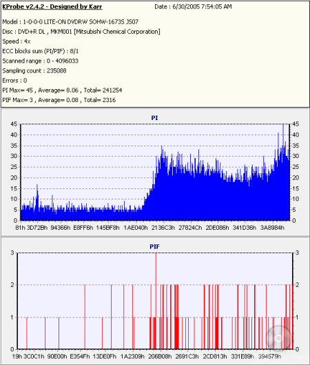 So what about writing quality? Testing a drive's DVD writing quality isn't easy. Until now, there were very few options, unless you wanted to shell out thousands of dollars for a certified test machine. Thanks to KProbe, we can test a disc's PI (Parity Inner) and PIF (Parity Inner Fail) rates.For these tests I used a Lite-On SOHW-1633S (firmware BS0S) and read the discs at 4x with the PI and PIF ECC sums set to 8 and 1 respectively. For comparison, I also tested the discs on a BenQ DW1620. When combined with Nero CD Speed, the DW1620 is able to report PI Errors, PI Failures, Parity Outer Failures and even jitter levels. For this test, the discs are read at 8x with both the PI and PIF ECC sums set to 8.