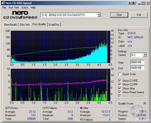 The dvd640i's 2.4x writing speed put it at a huge disadvantage in this test. As you can see, it was considerably slower than the drives from Pioneer and NEC, taking more than 45 minutes to write 8001MB of data. So what about writing quality? Take a look below.
