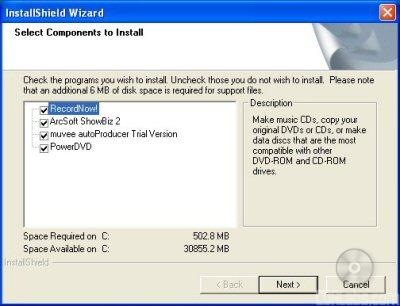 As I mentioned earlier, the dvd640i comes with two CD's full of software. The first of these contains a few different applications from Sonic, ArcSoft and CyberLink. If you have autorun enabled on your computer, the menu pictured below will automatically come up when you insert the disc.