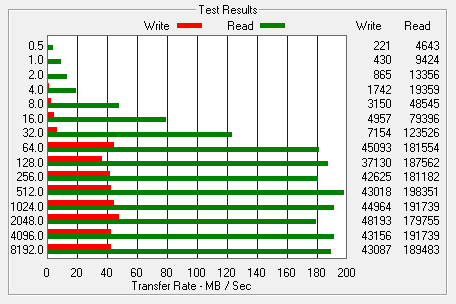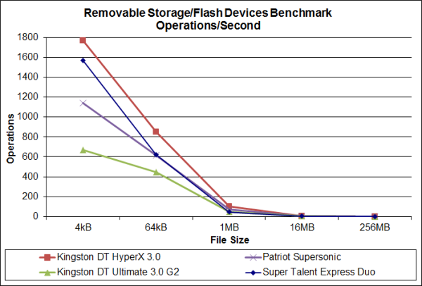 Designed with removable storage and flash devices in mind, this benchmark tests a drive's read, write and delete performance using six different file sizes (4kB, 64kB, 1MB, 16MB and 256MB). The results are then given in both operations per minute and the corresponding net transfer rate in MB/second. This benchmark also computes an "Endurance Factor," representing the wear and life expectancy of flash devices.