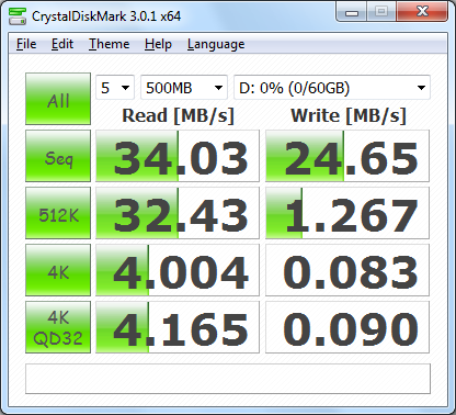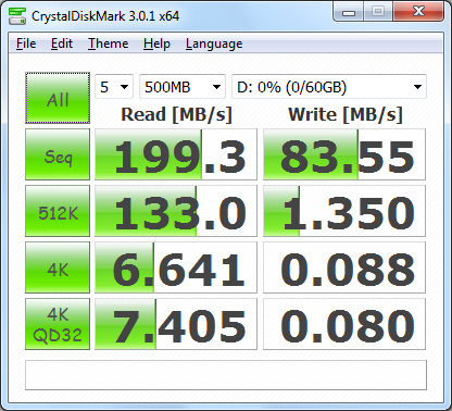 | 64kB Write: | 3.00 MB/s | 3.48 MB/s | 3.00 MB/s | 2.00 MB/s |