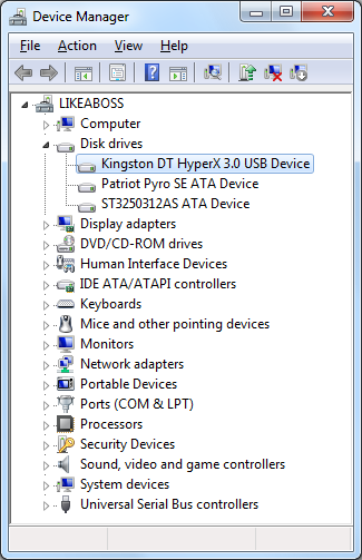 If installed correctly, the DataTraveler HyperX 3.0 should show up in the Device Manager. Under Windows 7, the drive is identified as a "Kingston DT HyperX 3.0 USB Device".