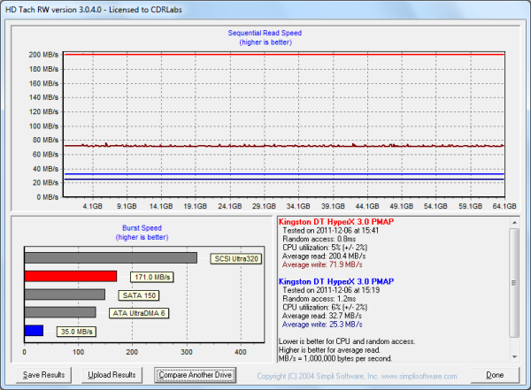 Next, I used HD Tach to test the DataTraveler HyperX 3.0's read, write and burst speeds as well as its seek times and CPU usage.