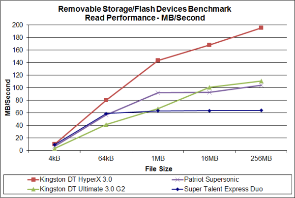 The DataTraveler HyperX 3.0 had no problems taking the top spot in this test. The drive took off like a rocket, eventually reaching 195.4 MB/s when reading 256MB files.