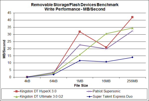 The DataTraveler HyperX 3.0 also performed fairly well when writing. While there were a few cases where it lagged behind the Supersonic, it had a clear advantage when writing larger files.