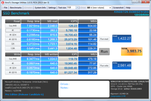 Looking at the screenshot above, you can see that the SSDNow V300 had average read and write speeds of 399.8 MB/s and 384.5 MB/s respectively, as well as a burst speed of 427.6 MB/s.