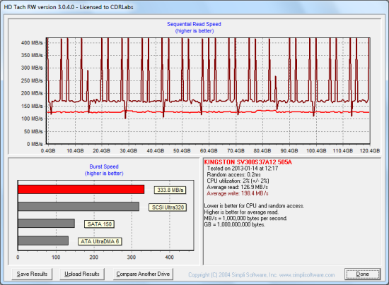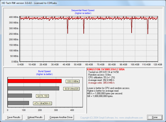 Next, I used HD Tach to test the SSDNow V300's read, write and burst speeds as well as its seek times and CPU usage.