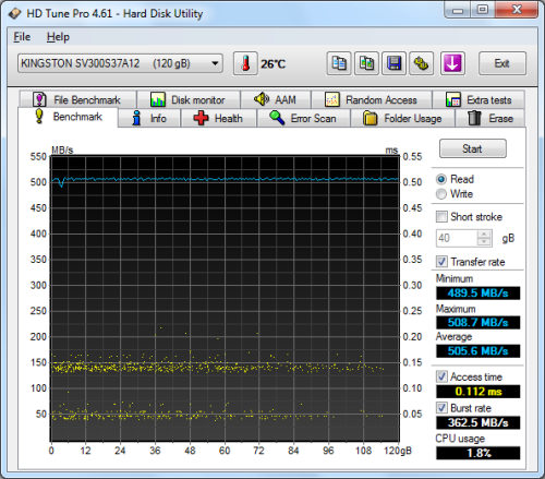 The SSDNow V300 performed very well when benchmarked with HD Tune. The drive had average read and write speeds of 505.6 MB/s and 454.0 MB/s, respectively, as well as a burst rate of 362.5 MB/s when reading.