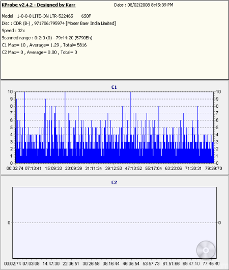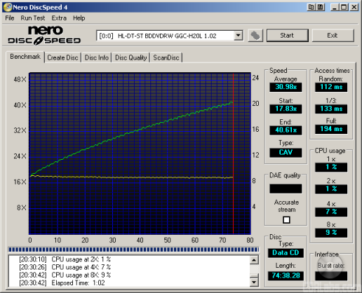 The Nero screenshot also shows that the GGC-H20L has a maximum CD writing speed of 40x and a 2048KB buffer. This buffer is also backed up by some form of buffer underrun protection. According to Nero, the GGC-H20L can write CD-Text and overburn. When testing the drive's capacity I found that the drive was able to overburn up to 95:10with CompUSA's 99 minute CD-R media.