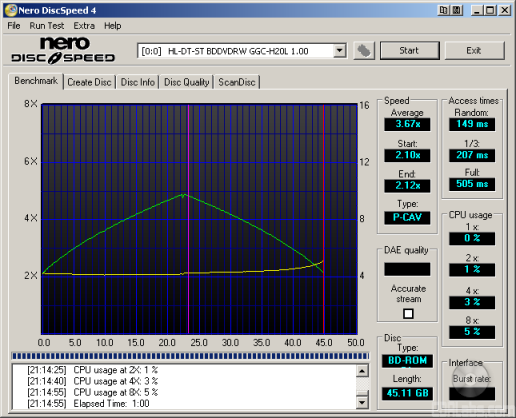 While the GGC-H20L is rated at 6x when reading single layer BD-ROM discs, its speeds are limited to only 4.8x when reading AACS protected titles. In our tests, the drive started reading at 2.01x and reached a maximum transfer speed of 4.82x.
