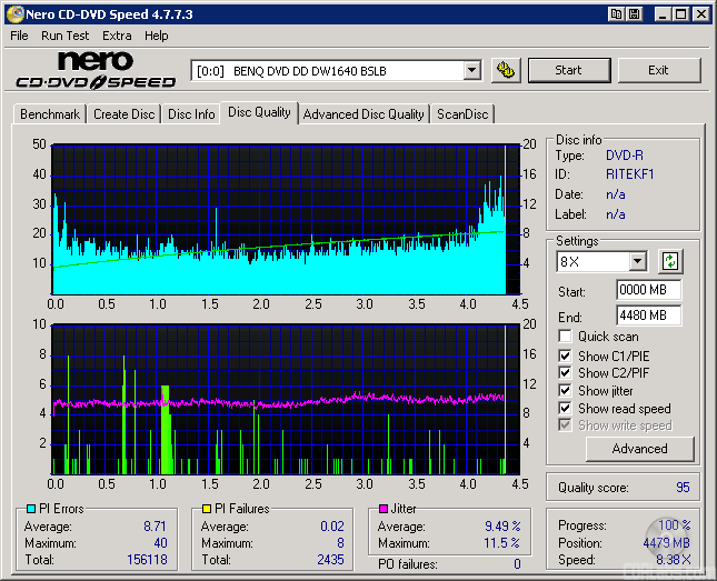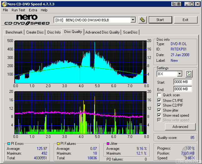 The writing quality was pretty good with Verbatim's DVD-R and DVD+R DL media and Memorex's 8x DVD+R DL discs. Aside from a few small spikes, the PI/PIF rates stayed within acceptable limits and there were no readability problems. Unfortunately, the results weren't nearly as good with Memorex's 2.4x DVD+R DL and RiDATA's 4x DVD-R DL media. The error rates were considerably higher, especially when scanned with the DW1640.