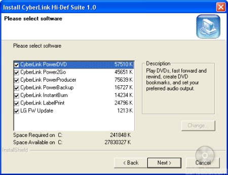 From here, you can choose to install PowerDVD, Power2Go, PowerProducer, PowerBackup, InstantBurn, LabelPrint or LG's firmware update utility. Simply select the components you want and click next a few times. Once the files are copied over, you can start burning your own discs.
