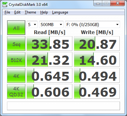 First, I ran a few quick tests using CrystalDiskMark. This benchmark tool measures the performance of a storage device by testing its sequential read and write speeds as well as its random read and write speeds using blocks 4KB and 512KB in size. The test was first run using a 100MB file and then a 500MB file.