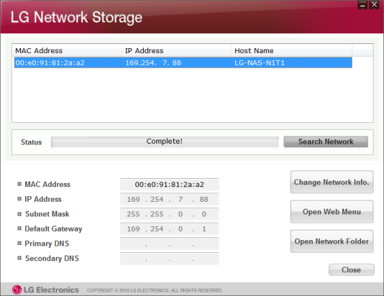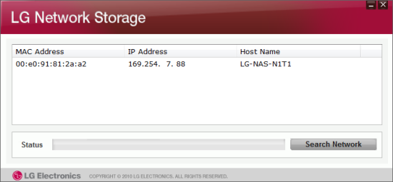 The NAS Detector software searches the network looking for LG NAS devices. When it finds one, it will display its IP address, MAC address and host name. Using the NAS Detector software, you can also change the network information, open the web menu or access the network folder.