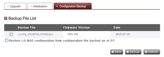 Firmware for the N1T1 and its optical disc drive can be downloaded from LG's website and updated through the web menu. Before doing so, it is highly recommended that you backup your current configuration.