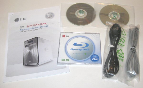 Sitting on top of the N4B1 is a small box which contains the accessories. Along with a quick start guide, you get an AC power cord, ethernet cable, LG NAS PC Software CD, LG NAS Installer CD and a blank 25GB BD-RE disc.
