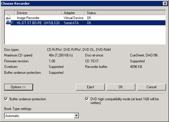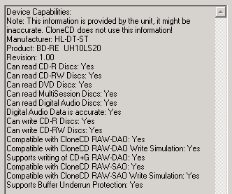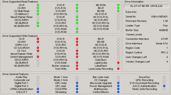 Here is a screen shot from Erik Deppe's Opti Drive Control. Among other things, this program queries the drive to see what its reading and writing capabilities are. Opti Drive Control had no problems detecting the UH10LS20's reading and writing speeds and supported disc types.