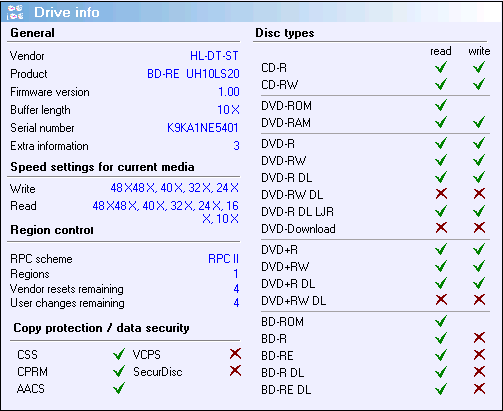 Opti Drive Control also shows that the UH10LS20 is an RPC-2 DVD drive. This means that the drive's region is stored in the firmware. The region can be changed five times and after that it cannot be changed anymore. Unfortunately, a patched RPC-1 firmware is not yet available for this drive.