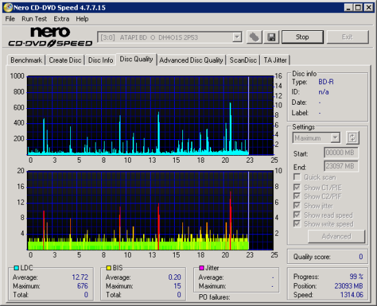 Like the DH-4O1S, the DX-4O1S is capable of performing write quality testing with Blu-ray Disc media. When combined with CD Speed, the drive is able to report the Long Distance Code (LDC) and Burst Indicator Subcode (BIS). While it's still too early to know what "good" results should look like, c't magazine has stated that the average LDC should stay below 13 and the maximum BIS should not exceed 8. In my own testing, I've found that the LDC reported by CD Speed is considerably higher than 13.