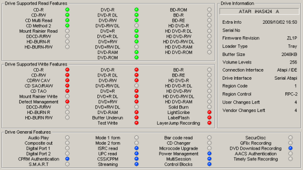 InfoTool also shows that the iHAS424 is an RPC-2 DVD drive. This means that the drive's region is stored in the firmware. The region can be changed five times and after that it cannot be changed anymore. While there isn't an RPC-1 firmware available for the drive, there is a utility available that can make the drive region free.