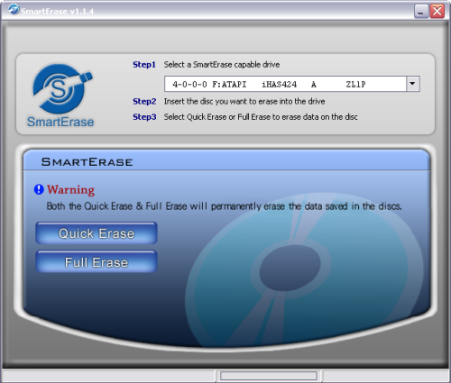 The iHAS424 is one of the first drives to support Lite-On's SmartErase technology. Similar in concept to Plextor's PlexERASE technology, SmartErase gives users the ability to destroy the data on CD-R, DVD±R and DVD±R DL media without physically damaging the disc itself. To do this, it uses the drive's laser beam to "re-record" over the lead-in and data sectors, rendering the disc unreadable and unrecoverable.