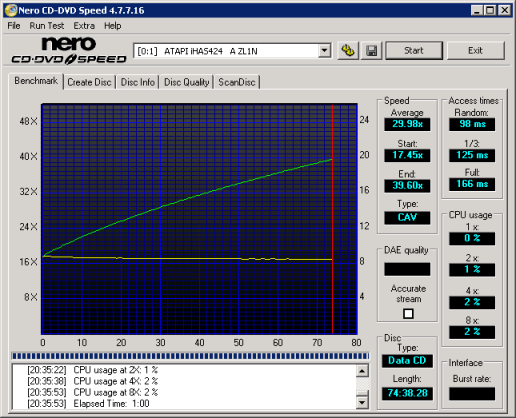 Nero also shows that the iHAS424 has a maximum CD writing speed of 48x and a 2048KB buffer. This buffer is backed up by Super-Link buffer underrun protection as well. According to Nero, the iHAS424 can also write CD-Text and overburn. When testing the drive's capacity, it had no problems overburning up to 99 minutes with our CompUSA media.