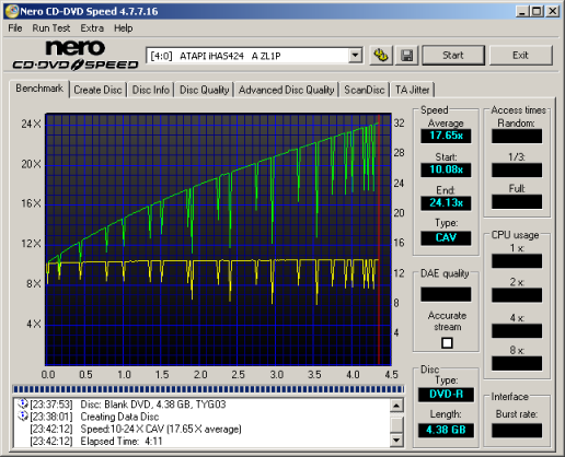 When writing to DVD+R and DVD-R media at 24x, the iHAS424 uses CAV. By looking at the screenshots above, you can see that Lite-On's new drive starts writing at about 10x and accelerates, reaching its maximum speed at the end of the disc.