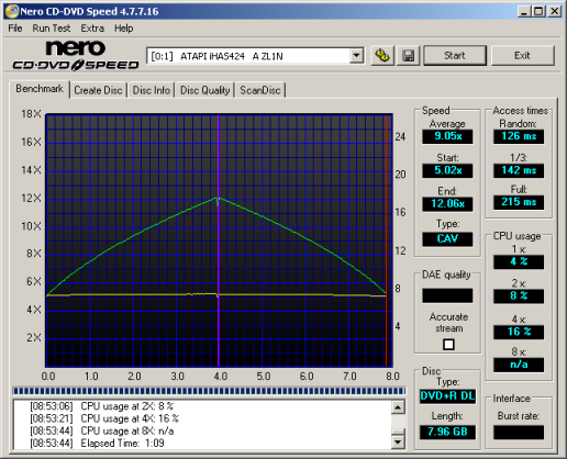The iHAS424 didn't slow down very much when reading single layer DVD videos. It started out at about 6.62x and reached a maximum read speed of 16.03x. Lite-On's new drive was also fairly quick when reading dual layer discs. By looking at the screenshot below, you can see that the drive's transfer speeds peaked at about 12x.